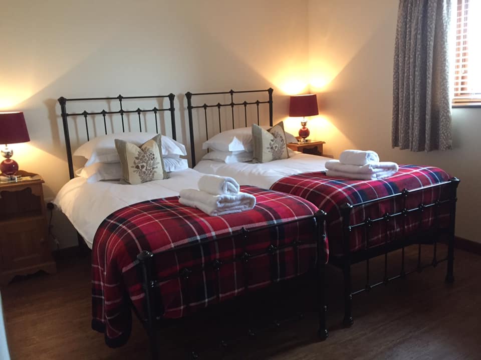 Two single beds two bedside cabinets, chest of draws and a double wardrobe, Hair dryer, Touch Table Lamps. The twin room and bathroom are next door to one another.